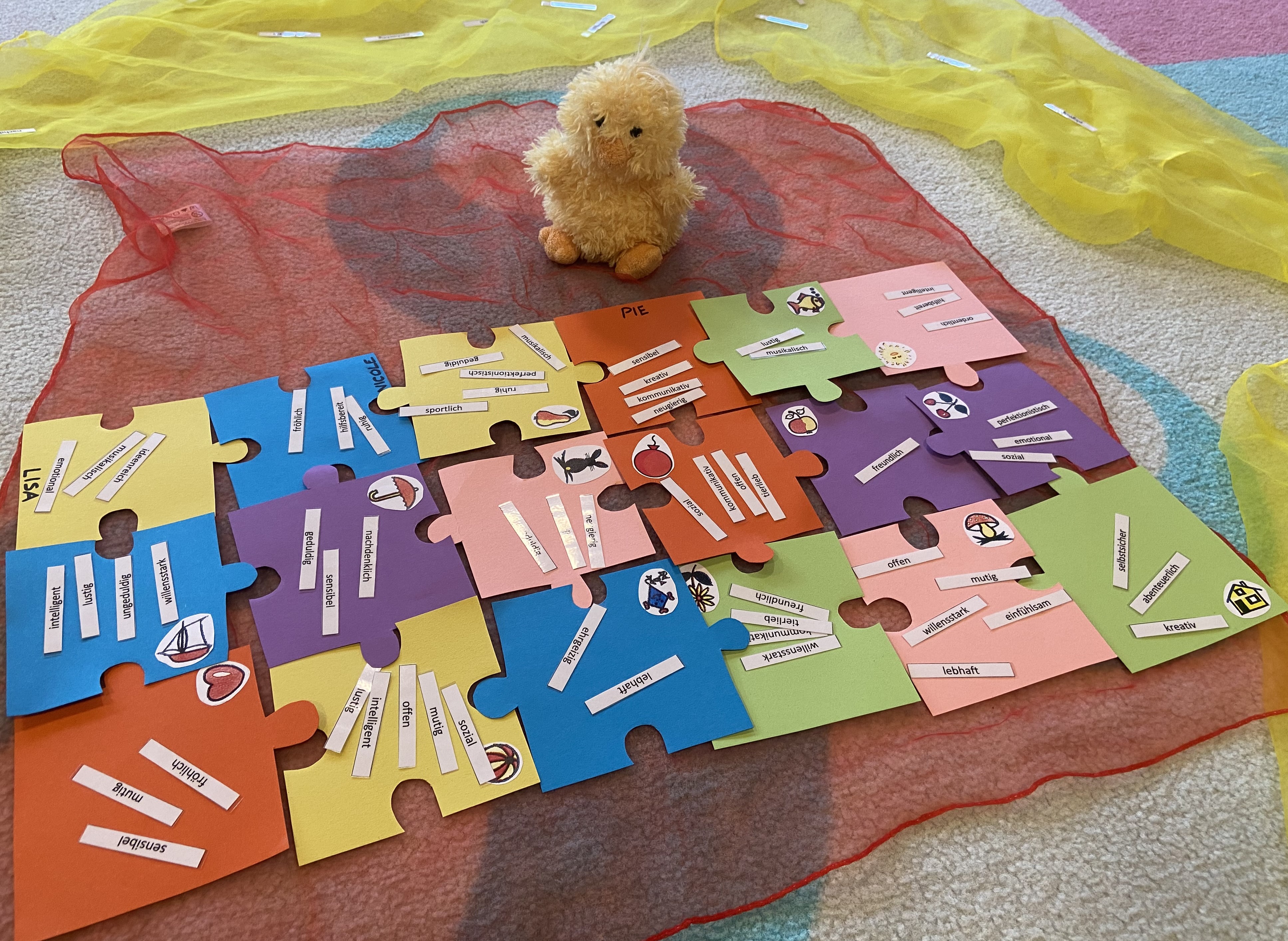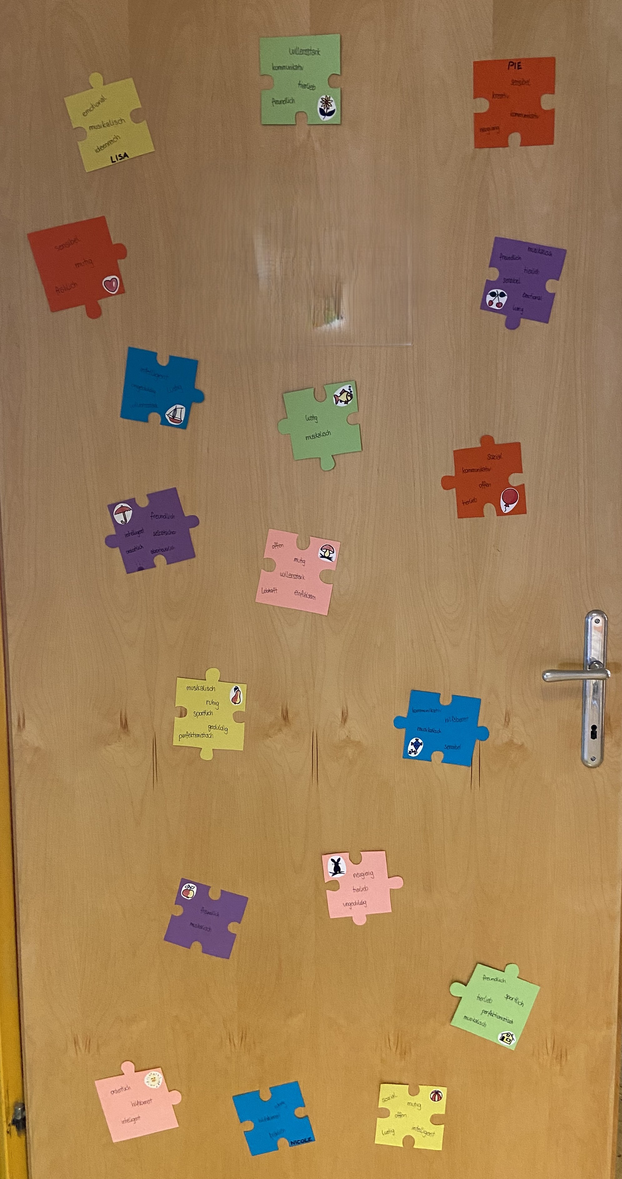 Beim Elternabend haben wir mit den vielen, individuellen Puzzleteilen ein großes gemeinsames Bild enstehen lassen. Jedes einzelne Puzzleteil steht für ein Kind mit unterschiedlichen Bedürfnissen, Stärken und Fähigkeiten. Durch das Zusammenfügen der Teile entsteht ein großes, harmonisches Ganzes - ein Bild, das für Gemeinschaft, Zusammenhalt und gegenseitige Unterstützung steht. Das Puzzle symbolisiert die Vielfalt und das Miteinander der Kinder.